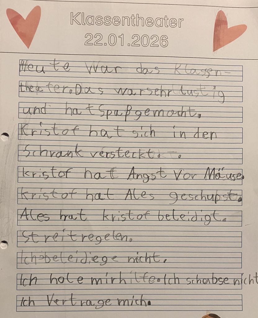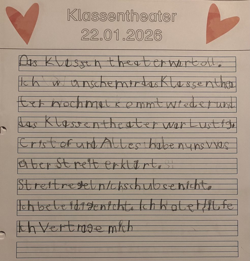 Die zweiten Klassen bekamen Besuch vom Klassenzimmertheater des CSE. Im interaktiven Theaterstück zum Thema Streit wurden Alltagssituationen mit viel Humor dargestellt, und die Kinder durften aktiv mitmachen und eigene Ideen einbringen — dabei lernten sie ganz nebenbei, wie man Konflikte fair lösen kann.